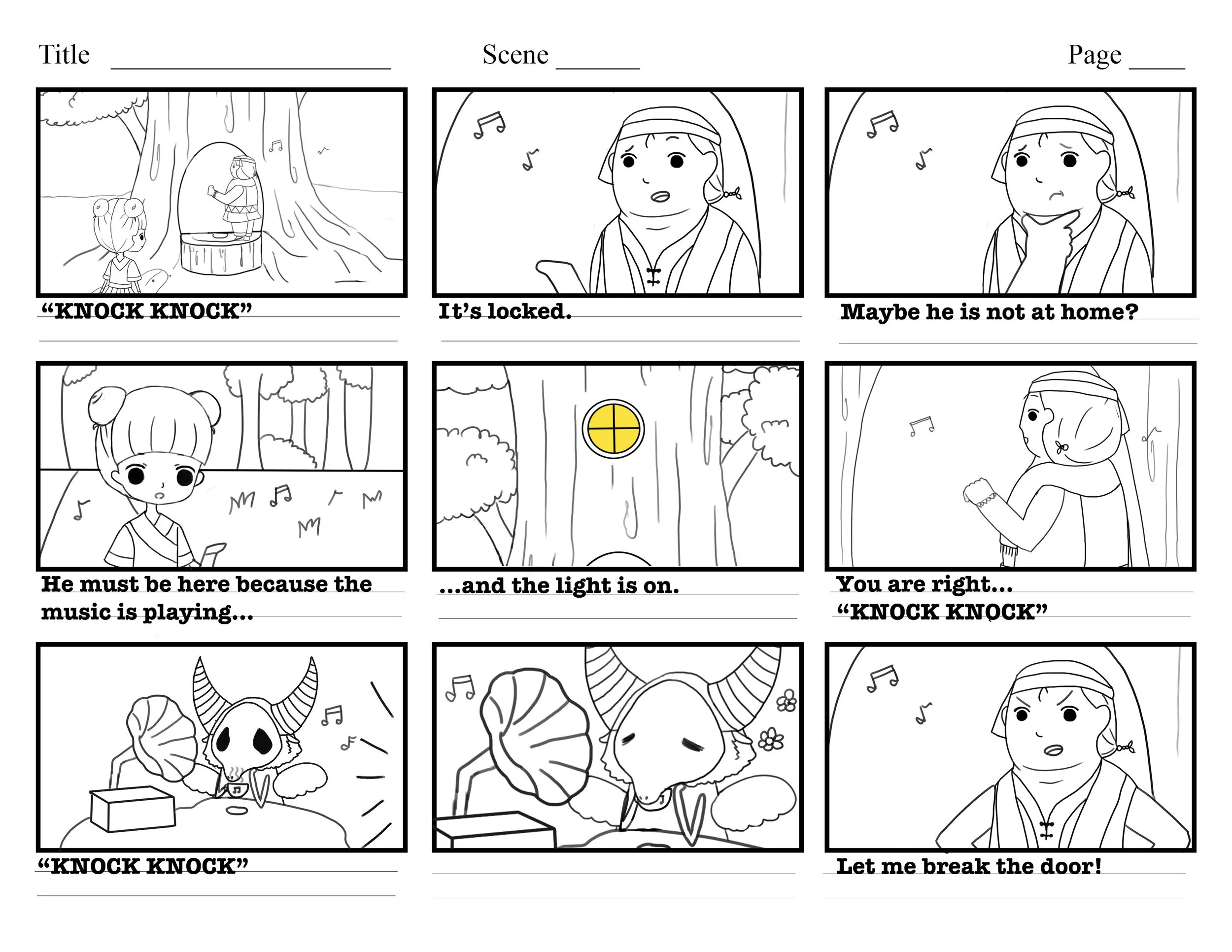 Wei is very good at playing the instrument and he sings very well. One day a monster in the forest steals his voice. The storyboard begins here.
